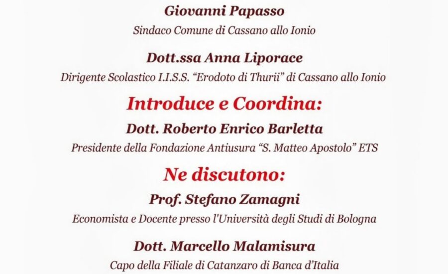 Contribuiranno a spiegare meglio l’importanza di tali esigenze l’economista e docente presso l’Università di Bologna, Prof. Stefano Zamagni, il Direttore della Filiale di Catanzaro di Banca Italia, Dott. Marcello Malamisura, il dirigente dell’Ufficio VIII della Direzione V del Ministero dell’Economia e delle Finanze, Dott.ssa Carla Napolitano, il presidente della Banca di Credito Cooperativo Mediocrati, Dott. Nicola Paldino, e l’Onorevole Marco Osnato, presidente della VI Commissione Finanze della Camera.