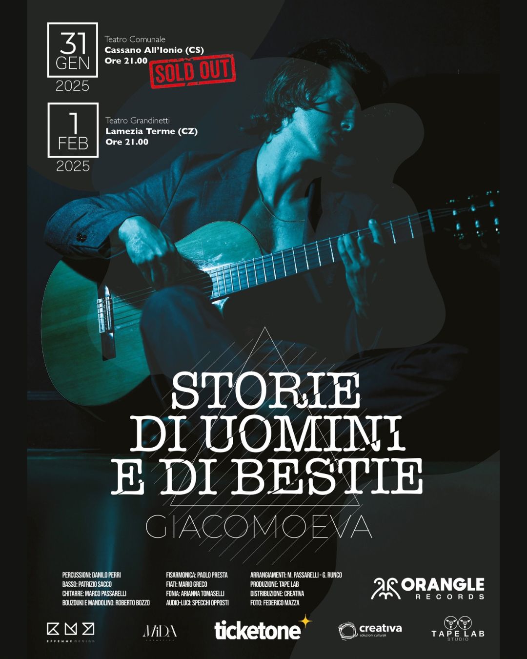 Venerdì 31 gennaio 2025, alle ore 21.00, il palco del Teatro Comunale di Cassano All’Ionio ospiterà in ANTEPRIMA ASSOLUTA “Storie di Uomini e di Bestie”, il primo spettacolo musicale del cantautore calabrese Giacomo Eva.
