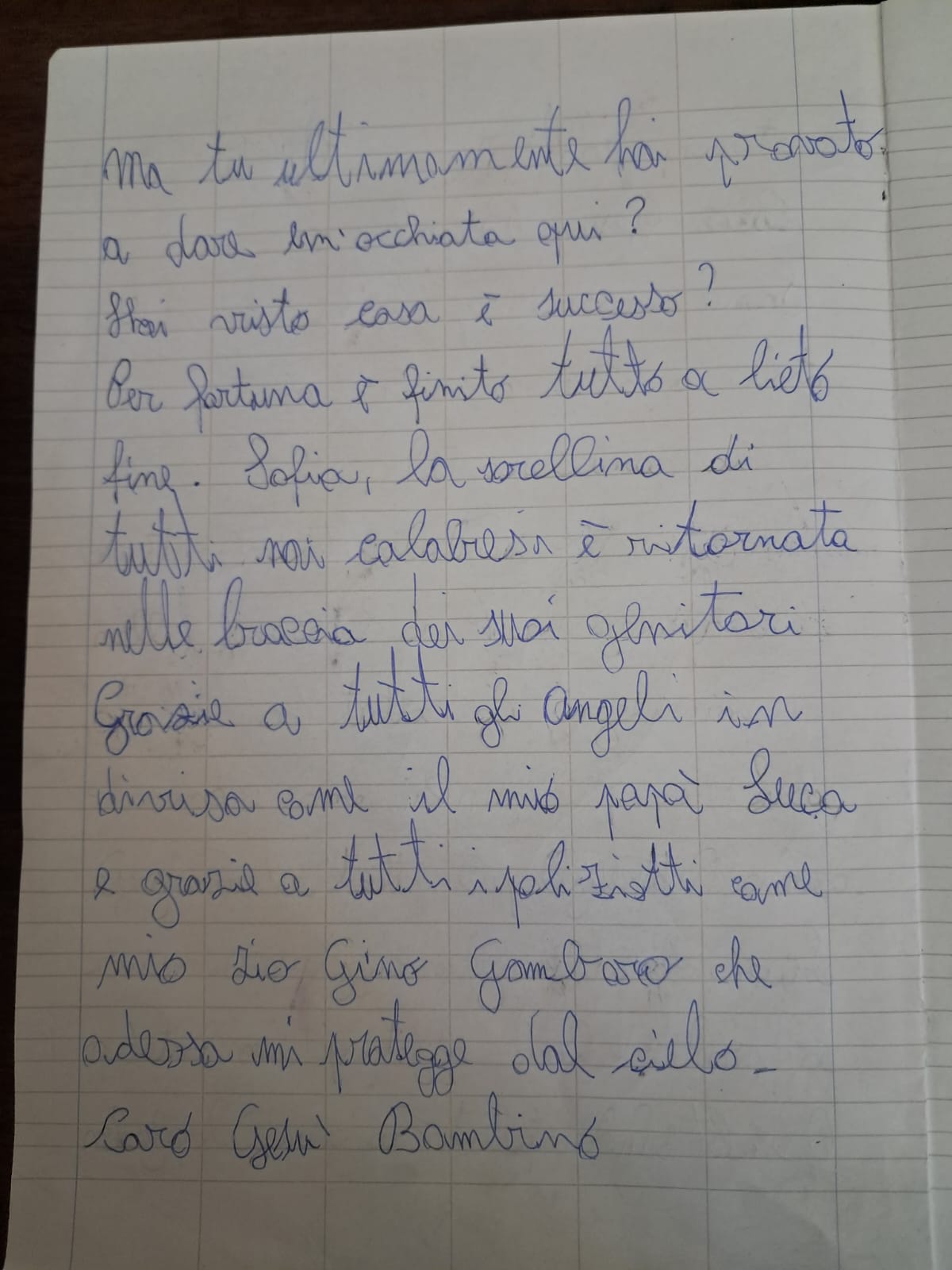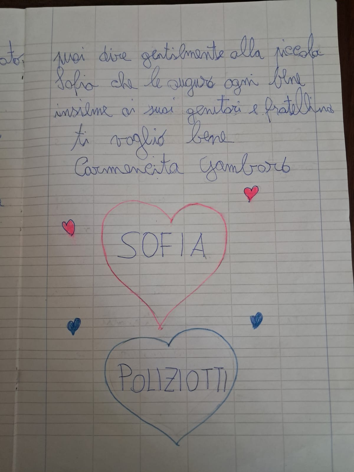 Una lettera scritta con la purezza e l’ ingenuità di una bimba che ha voluto sensibilizzare e catturare l’ attenzione verso i poliziotti che hanno ritrovato la piccola Sofia e riportata tra le braccia dei suoi genitori. Con penna tremante la piccola