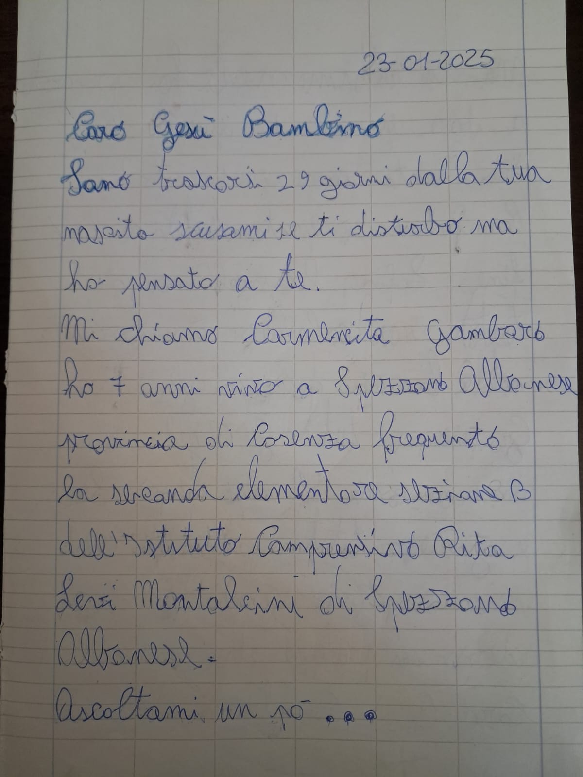 “Caro Gesù Bambino sono trascorsi 29 giorni dalla tua nascita,scusami se ti disturbo ma ho pensato a te” Inizia così la lettera inaspettata di Carmencita Gambaro , bambina di sette anni alunna della seconda classe dell’ Istituto comprensivo Rita Levi Montalcini di Spezzano Albanese con la guida del dirigente scolastico dott.ssa Maria Cinzia Pantusa.
