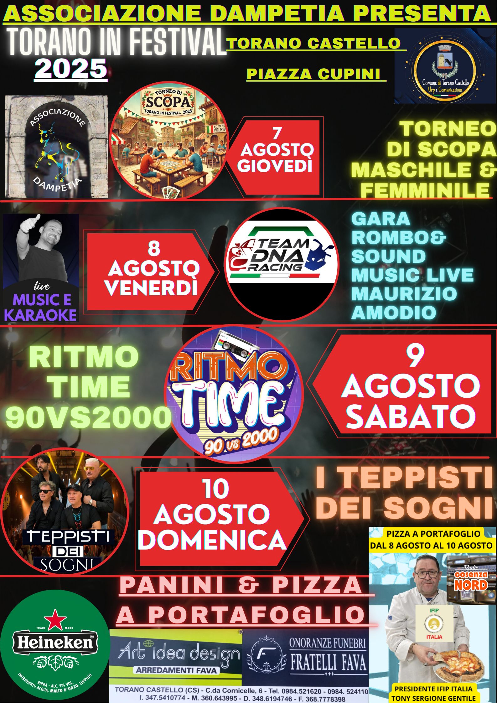 L’Associazione Dampetia è lieta di annunciare l’edizione 2025 di Torano in Festival, un evento che animerà il centro di Torano Castello con quattro giornate all’insegna della musica, del divertimento, della tradizione e del gusto.