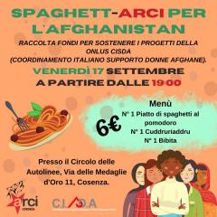 Arci Cosenza organizza, venerdƬ 17 alle ore 19:00 presso il Circolo delle Autolinee (ex Bar delle Autolinee), corsia 1 dell'autostazione di Cosenza, una spaghettata per l'Afghanistan con punto di raccolta fondi che andranno