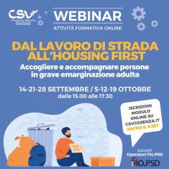 āAccogliere e accompagnare persone in grave emarginazione adulta: dal lavoro di strada allāhousing firstā. Si chiama cosƬ il corso di formazione promosso dal CSV Cosenza in collaborazione con la Fio.PSD (Federazione Italiana degli