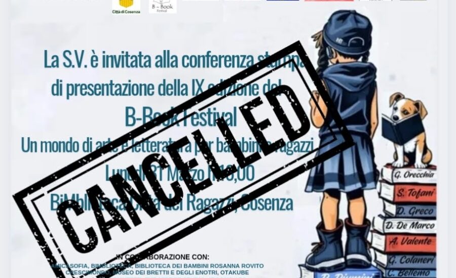 Per sopraggiunti impegni istituzionali del Comune di Cosenza e della Fondazione Carical, la conferenza stampa, indetta per lunedì 31 marzo, alla Città dei Ragazzi di Cosenza, per la presentazione del B-Book è