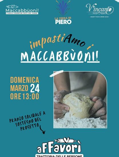Domenica 24 marzo al VāIncanto di Cosenza ImpastiAmo i Maccabbùoni: i ragazzi de āLa Terra di Pieroā si metteranno allāopera con acqua, farina e mattarelli per servire in tavola la pasta fatta